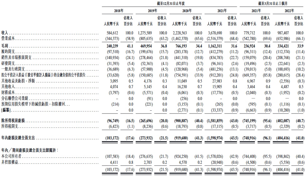 财务方面,于2018年、2019年、2020年及2021年及截至2021年及2022年3月31日止三个月,公司的收入分别约为5.85亿元、12.76亿元、22.29亿元、36.79亿元、7.8亿元及9.87亿元,2018年至2021年的复合年增长率约为84.6%,而从截至2021年3月31日止三个月至截至2022年3月31日止三个月,同比增长26.6%。