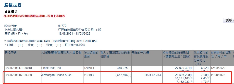 智通财经APP获悉,香港联交所最新资料显示,8月11日,JPMorgan Chase & Co.增持赣锋锂业(01772)约266.77万股,每股作价72.2533港元,总金额约为1.93亿港元。增持后最新持股数目约为2859.62万股,最新持股比例为7.08%。
