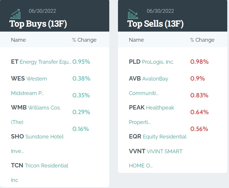 前五大卖出标的分别是:安博(PLD.US)、阿湾物产(AVB.US)、Healthpeak Properties(PEAK.US)、资产住宅公司(EQR.US)、Vivint Smart Home(VVNT.US)。