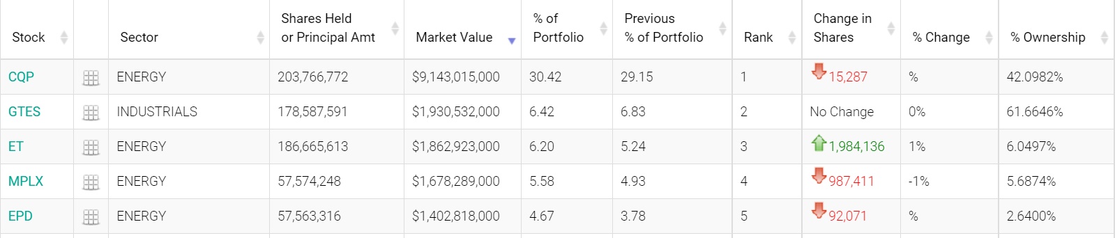 Energy Transfer(ET.US)位列第三,持仓约1.867亿股,持仓市值约18.63亿美元,较上季度持仓数量增加了1%,占投资组合比例为6.20%。