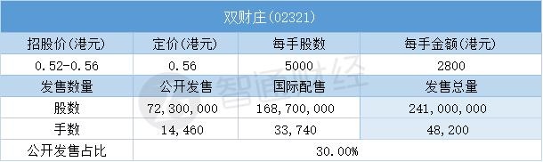 智通财经APP获悉,8月18日,双财庄(02321)配售结束。配售招股价0.52-0.56港元,最终定价0.56港元,每手2800港元。