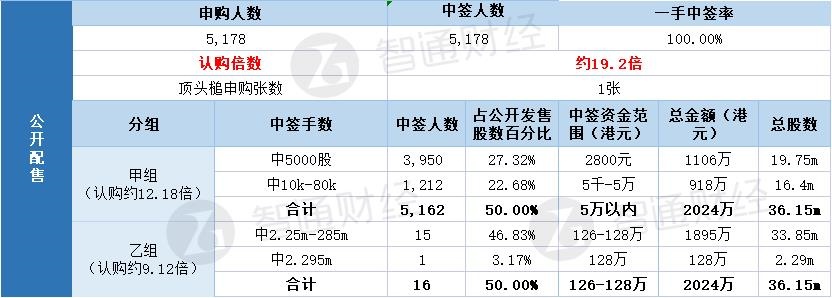 其中,公开配售申购人数5178人,一手中签率100%,认购倍数约19.2倍。