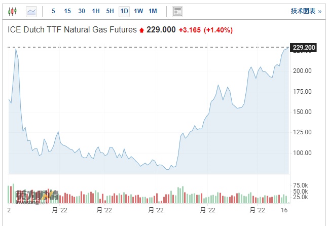 截至发稿,欧洲基准荷兰近月天然气期货价格报229欧元/兆瓦时,已逼近历史最高纪录。