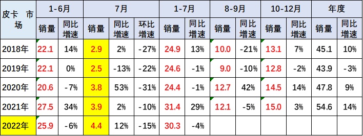 今年1-7月的总体皮卡走势相对较好,达到30.3万辆,较2021年1-7月下降4%,产销表现还是很好的。