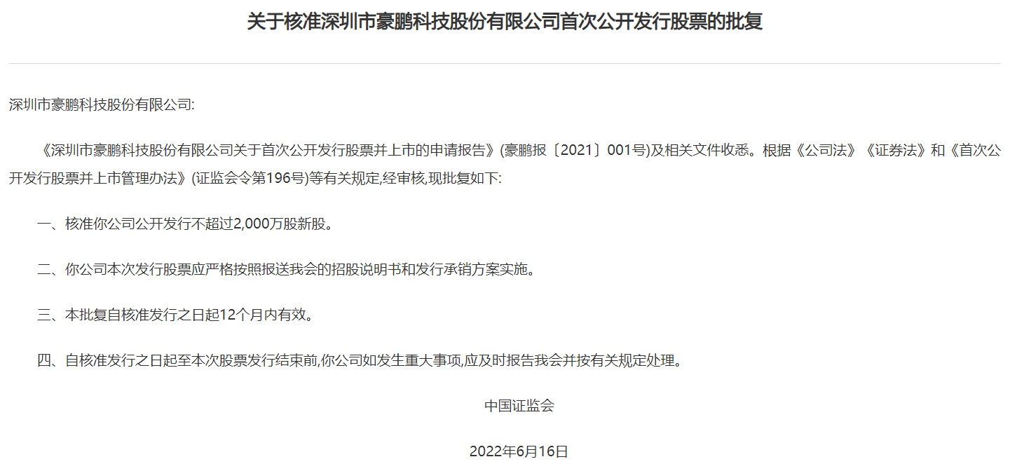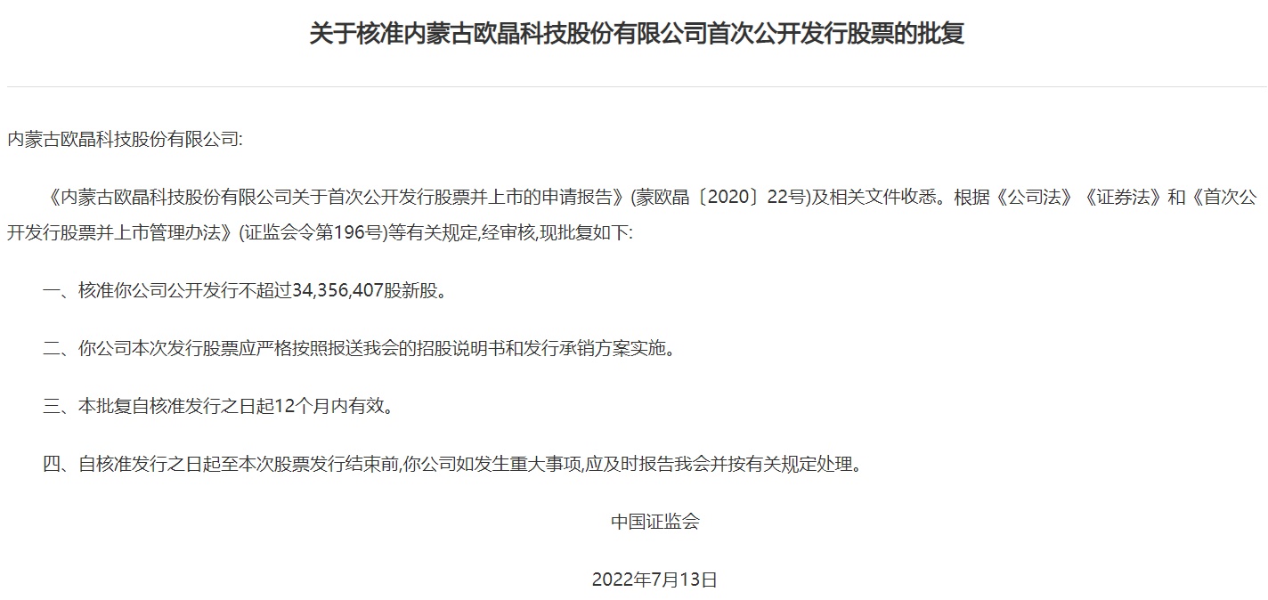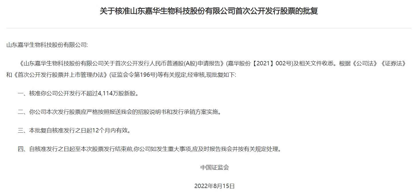 智通财经APP获悉,8月18日,中国证监会发布关于核准山东嘉华生物科技股份有限公司、深圳市豪鹏科技股份有限公司、内蒙古欧晶科技股份有限公司首次公开发行股票的批复,分别核准三家公司公开发行不超过4,114万股、2,000万股、34,356,407股新股。