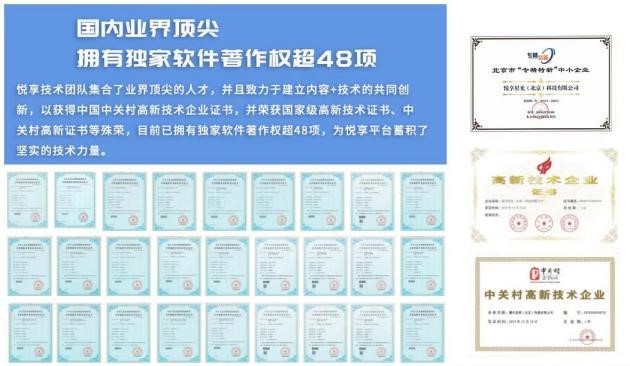 悦享拥有业界顶尖的技术人才团队,致力于建立新经济+新技术的创新,是国家级高新技术与中关村高新技术企业,国家专精特新企业,为悦境CheerReal平台的发展蓄积了坚实的技术力量。目前悦境CheerReal平台有近百人的核心技术团队,分别专注于区块链生态研发、安全等相关技术领域,深耕版权确权、哈希存证、IPFS、DEX、IDEX等技术的研发。