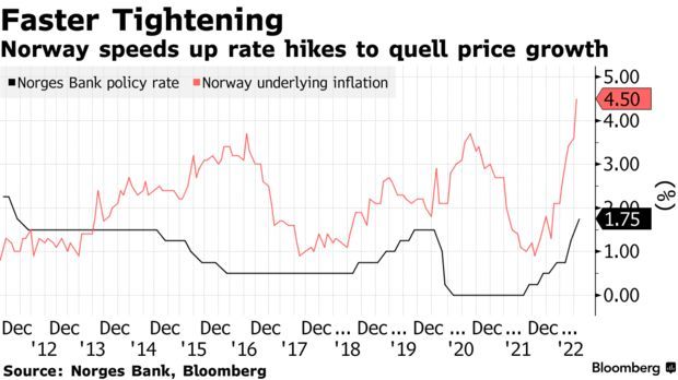 智通财经APP获悉,挪威央行周四将基准利率上调50个基点至1.75%,这是2012年3月以来的最高水平。挪威央行还表示,利率“极有可能在9月份进一步上调”以减缓飙升的通胀,但并未说明上调幅度。