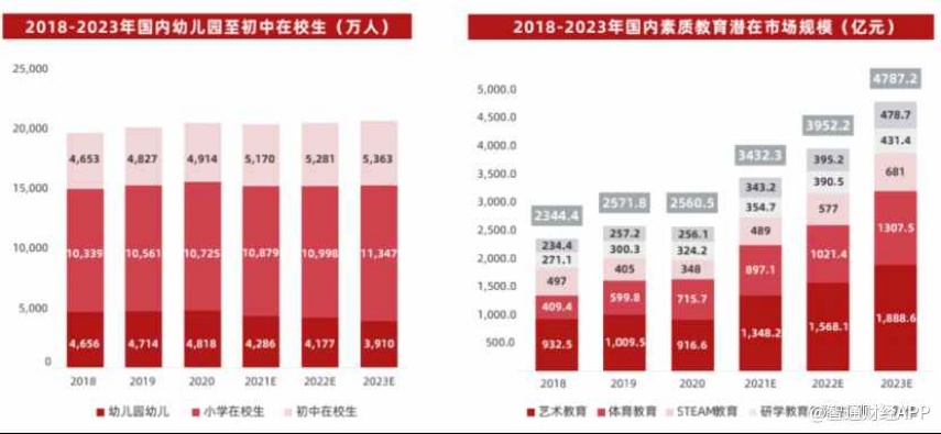数据显示,2013-2019年素质教育市场复合增速为12.4%,2020年虽然在疫情影响下略有下滑,但随着“双减”政策落实和素质教育的全面发展,预计从2021年起行业仍能迎来较大的市场规模增长,并预计在2023年国内素质教育潜在市场规模能突破4787亿元。