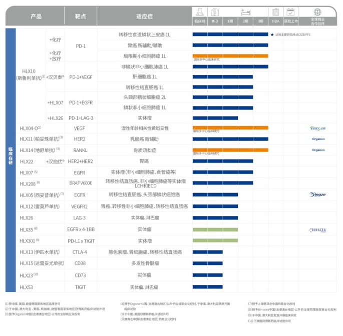 公司创新产品管线中有超过20款候选药物在研,全面覆盖HER2、EGFR、PD-1/L1、BRAF、CD73、LAG-3、TIGIT、4-1BB、GARP等高潜力前沿靶点。公司同步优化抗体平台,积极开展创新靶点、双特异性抗体、ADC等产品的布局,持续推动早期项目储备,并基于引进项目积极开发更多被市场所需要的创新型产品,寻求其与现有创新产品管线之间的协同。