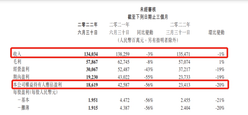 具体而言,2022年Q2,腾讯实现营业收入为入1340.34亿元,同比下滑 3%;毛利为578.67亿元,同比下降8%;净利润为186.19亿元,同比下滑56%;非国际会计准则净利润为(Non-IFRS)281.39亿元,同比下降17%。