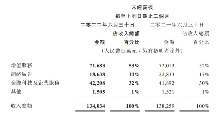 广告业务方面,由于互联网服务、教育及金融领域需求明显疲软,亦表现较为低迷。期内,腾讯的网络广告业务录得收入为186亿元,同比下降18%。其中,。社交及其他广告收入下降17%至161亿元,由于广告需求疲软、广告竞投量低迷,使得eCPM 下滑。媒体广告收入下降25%至25亿元,此乃由于腾讯视频及腾讯新闻的广告收入下滑所致。