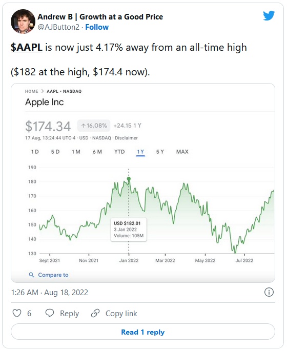 不过,在6月触及低点之后,截至周四收盘,苹果股价已反弹约34%至174美元上方,并且距离该股在今年1月创下的约182美元的历史高点仅差4.17%的涨幅。