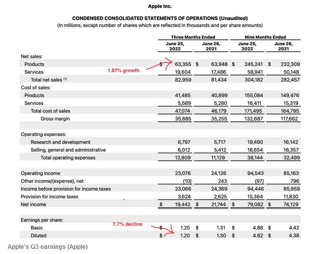 在估算苹果未来的增长时,我们必须考虑两件事。其一,市场可能正处于衰退之中,美国经济已经连续两个季度负增长,因此,在未来的经济增长时期,苹果的营收增速将有所改善。其二,利润下滑可以通过削减成本来弥补,而苹果已经在这样做了,因此未来几个季度该公司的利润增长同样可能会有所改善。