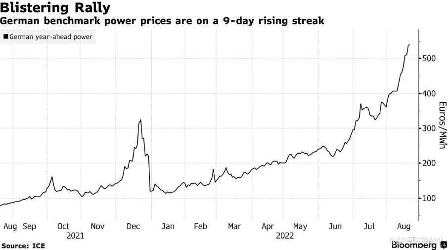 作为欧洲基准的德国明年交付的电力合同价格上涨1.4%,达到创纪录的每兆瓦时545欧元,已连续9天上升。欧洲明年交付的煤炭期货价格上涨2.1%,至创纪录的每吨311.50美元。