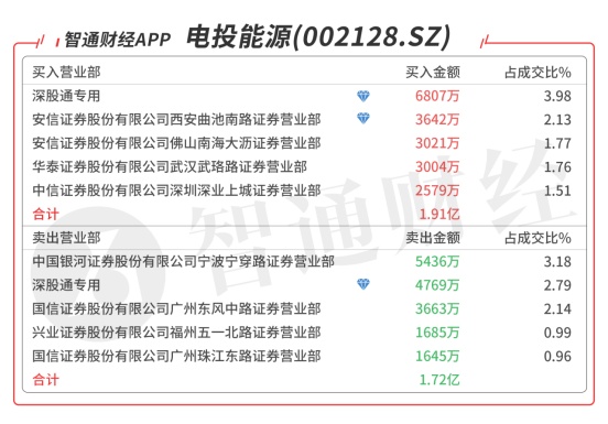 电投能源(002128.SZ):多主力现身龙虎榜,深股通对倒净买入2038万元,买二是顶级游资方新侠的席位买入3642万元,当日净买入2284万元,该股今日强势突破箱体,预计压力位在前期高点附近。