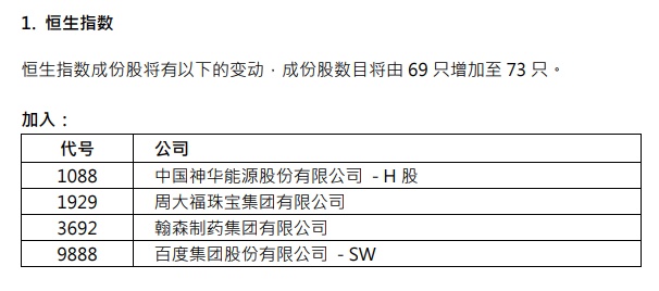 中国神华(01088)、周大福(01929)、翰森制药(03692)、百度集团-SW(09888)将被纳入恒生指数成份股。成份股数目将由69只增加至73只。