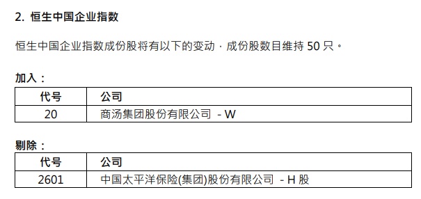 商汤-W(00020)将被纳入恒生中国企业指数成份股,中国太保(02601)将被剔除。成份股数目维持50只。
