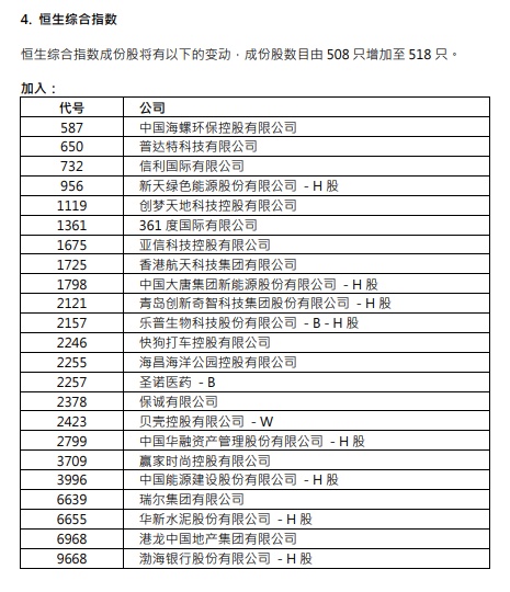 海螺环保(00587)等将被纳入恒生综合指数成份股,阳光房地产基金(00435)等将被剔除。成份股数目由508只增加至518只。