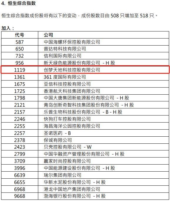 智通财经APP获悉,8月19日,恒生指数公司宣布截至2022年6月30日的恒生指数系列季度检讨结果,所有变动将于2022年9月5日(星期一)起生效。其中,创梦天地(01119)获纳入恒生综合指数成份股。