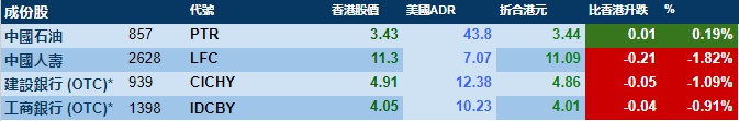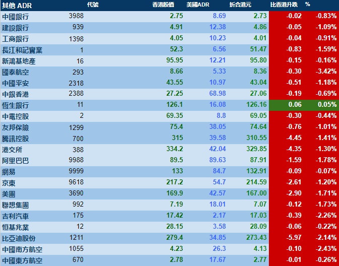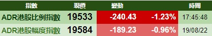 智通财经APP获悉,周五美股三大指数集体收跌,港股ADR指数下跌,按比例计算,收报19533点,较香港收市跌240.43点或1.23%。