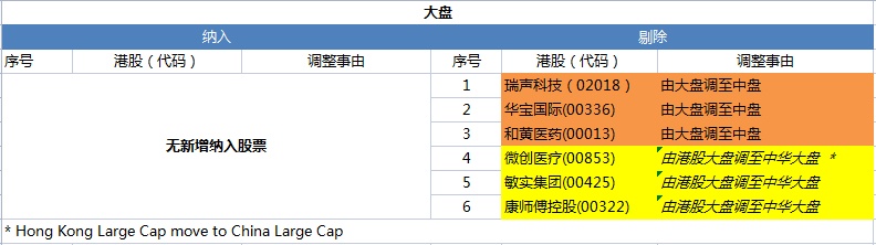 具体来看,大盘指数此次无新增纳入港股标的,瑞声科技(02018)、华宝国际(00336)、和黄医药(00013)因市值变化由大盘调至中盘。