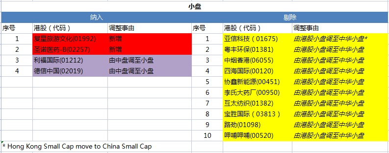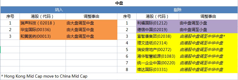 中盘指数除上述三只由大盘调入的股票之外,本次亦无新增。利福国际(01212)、德信中国(02019)因市值变化调整至小盘股中。