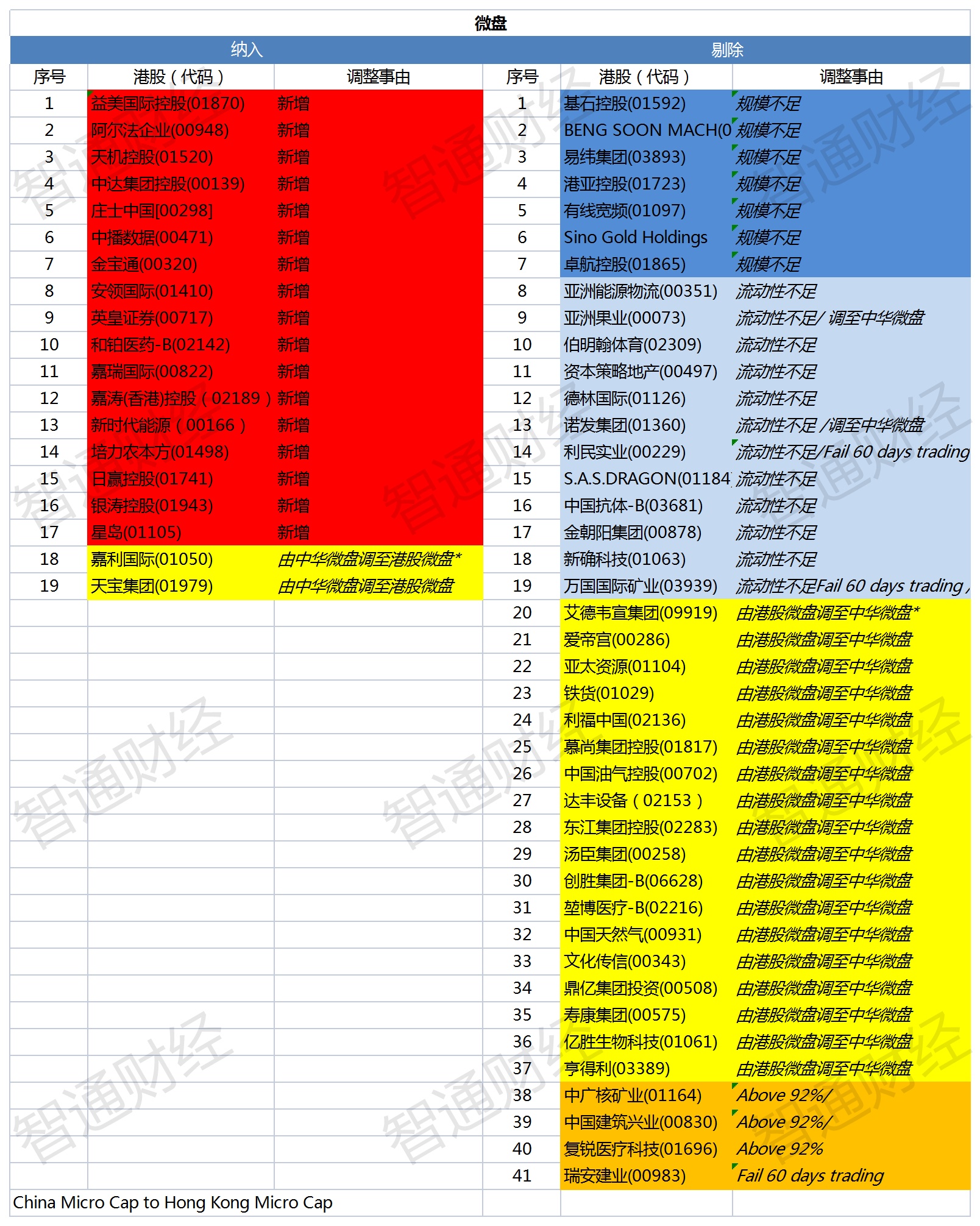 此外,微盘股此次新增纳入17只港股,包括益美国际控股(01870)、阿尔法企业(00948)等;因规模不足、流动性不足等原因,剔除了基石控股(01592)等股票。