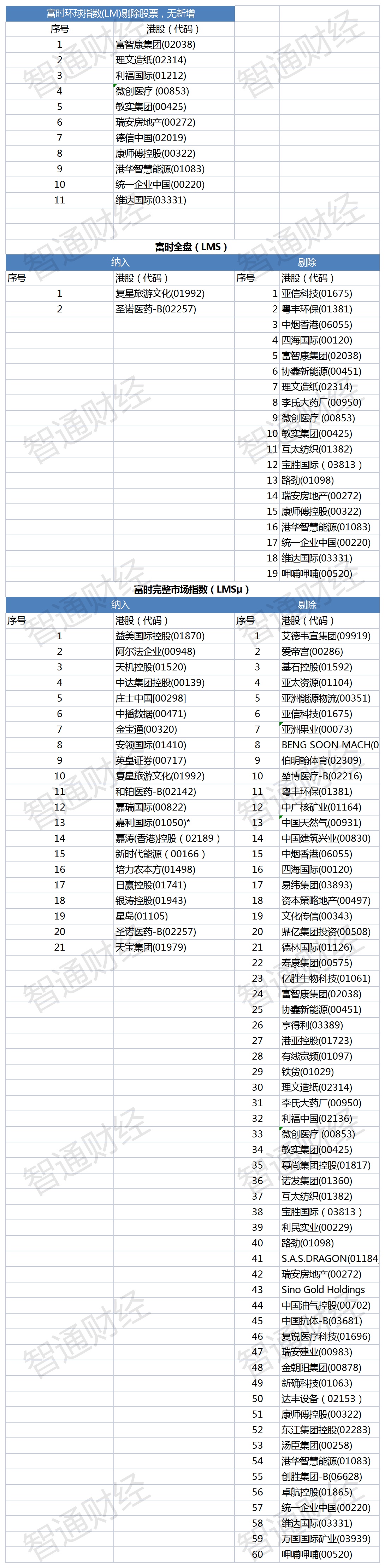 此外,富时环球指数(LM)、富时全盘指数(LMS)、富时完整全市场指数(LMSμ)本次具体变化如下: