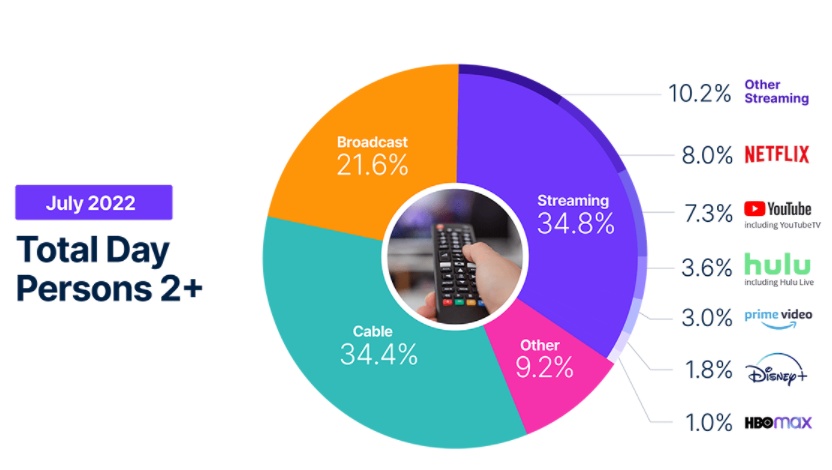 收视率巨头尼尔森对电视递送平台的月度宏观调查“The Gauge”显示,在经历了四个月的新高后,加上传统电视在夏季的低迷,流媒体的使用率上升至34.8%。