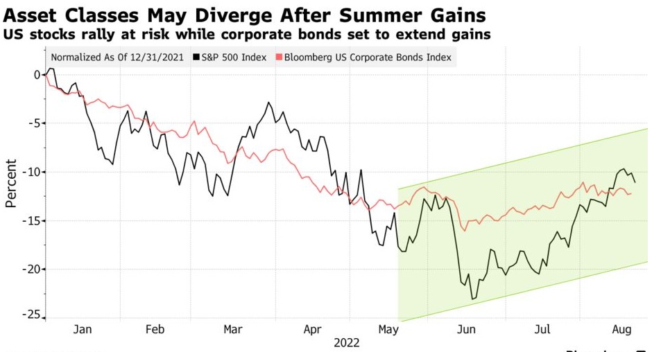 在经历了残酷的上半年之后,两个市场都准备好了反弹。这一涨势是由强劲的盈利和对猖獗的通胀稍有降温将使美联储及时放慢加息步伐以避免经济收缩的希望点燃的。7月和8月近12%的涨幅使美国股市有望迎来有记录以来最好的夏季之一。自6月中旬触底反弹以来,美国公司债上涨4.6%,全球公司债上涨3.4%。在同步上涨后,两者现在势将分道扬镳,债市看来更有能力延续升势,因在经济下滑时避险的热潮将抵消风险溢价的上升。