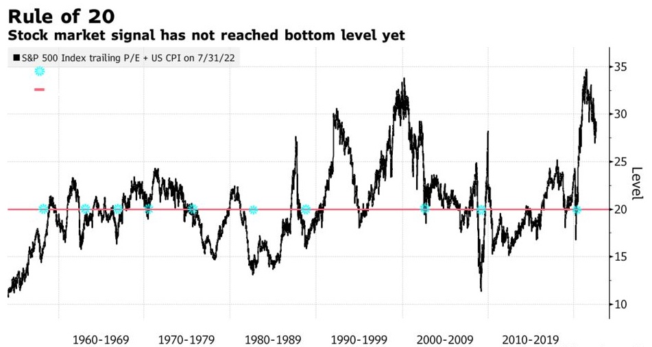 一些技术指标也显示,美国股市将恢复下跌。美国银行的一项指标将标普500指数的往绩市盈率与通货膨胀率结合起来,该指标自上世纪50年代以来每次市场触底前都跌破20。但在今年的抛售潮中,该指数仅低至27。