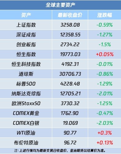 美股上周五收跌,科技股跌幅领先。上周美股三大股指均录得跌幅。对美联储激进加息的担忧重新浮现。市场继续评估央行加息路径与美国经济衰退的可能性。截至收盘,道琼斯指数跌0.85%,上周累跌0.16%;纳斯达克指数跌2.01%,上周累跌2.62%;标普500指数跌1.29%,上周累跌1.21%。