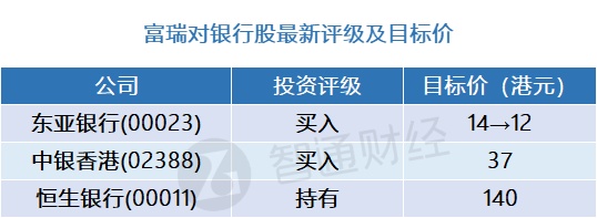 智通财经APP获悉,富瑞发布研究报告称,据评估香港银行减值风险,中银香港(02388)将保持韧性,重申为首选“买入”,并将受惠于净息差大幅扩张,商业房地产相关拨备拖累恒生银行(00011)和东亚银行(00023)2022年上半年的盈利,要留意二者回购和派息情况。假设没有新的“风险”生成,该行预计恒生和东亚2022年下半年将在商业房地产贷款额外作出19/21亿元拨备。