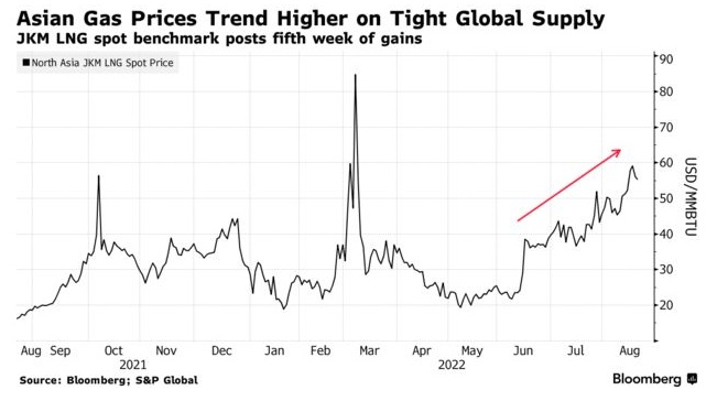 俄罗斯天然气工业股份公司上周五表示,将在8月31日停止关键的北溪1号管道并进行三天的维护,这将进一步推动欧洲天然气基准价格至创纪录水平。亚洲的液化天然气交易商对该管道无法按计划恢复供应表示担忧,这将在俄罗斯逐步削减对其最大客户欧洲的供应后进一步收紧全球市场。