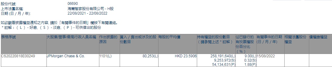 智通财经APP获悉,香港联交所最新资料显示,8月15日,小摩增持海尔智家(06690)8.0253万股,每股作价23.5906港元,总金额约为189.32万港元。增持后最新持股数目约为2.582亿股,最新持股比例为9%。