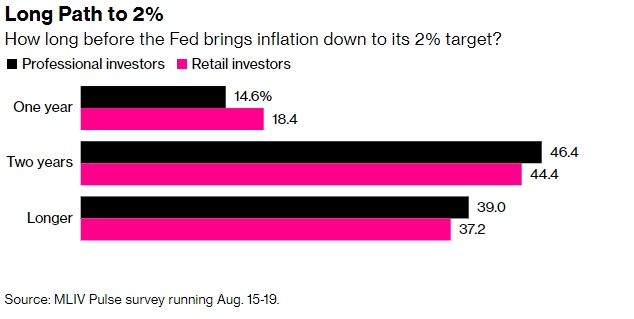 包括策略师和短线交易员在内的900多位受访投资者之中,大多数人都认为通货膨胀率已经见顶。尽管如此,仍有高达84%比例的人士表示,鲍威尔领导美联储可能需要两年或更长时间才能将利率降至2%这一官方长期目标。与此同时,美国消费者将削减开支,失业率将攀升至4%以上。
