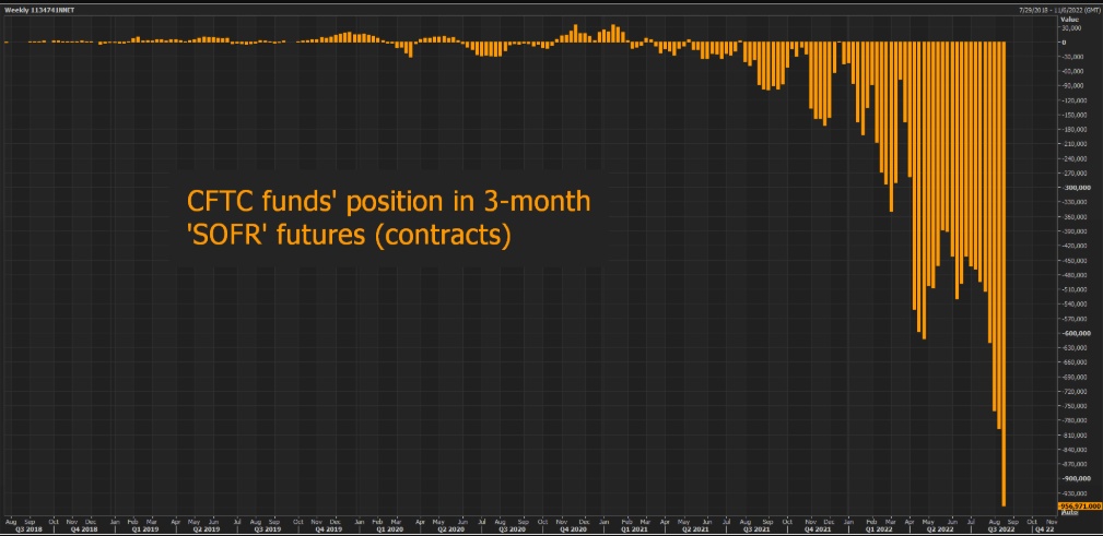 对冲基金对美国加息的押注规模也创下历史新高。数据显示,这些对冲基金不仅在约100万份有担保隔夜融资利率(SOFR)利率期货中持有创纪录的空头头寸,而且他们累积这一押注的速度也令人震惊。目前交易员已将SOFR利率期货所暗示的美联储终端利率从8月初的3.25%左右推高至3.70%,并预计联邦基金利率将在明年3月见顶。