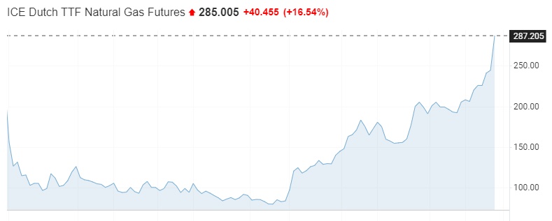 数据显示,截至发稿,欧洲基准荷兰近月天然气期货价格涨逾16%,至每兆瓦时285.005欧元。与此同时,德国未来一年电价也上涨了13%,达到创纪录的630欧元/兆瓦时。