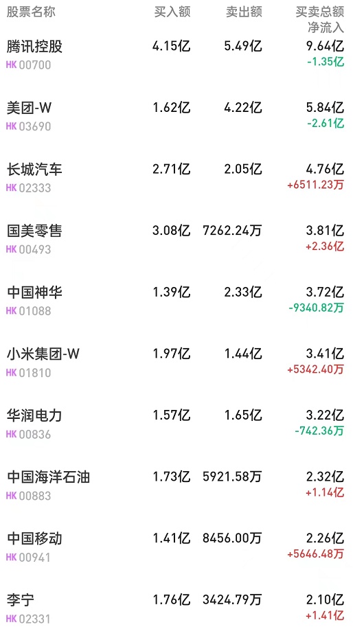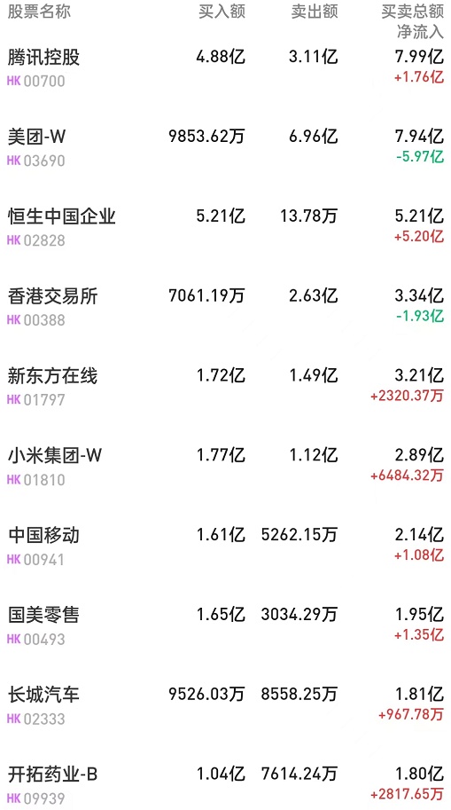 腾讯(00700)获净买入4175万港元。消息面上,德银发布研究报告称,对腾讯长期增长前景持积极态度。公司第二季收入比市场预期略低出1%,但经调整纯利仍比市场预期高出15%。展望下半年,德银认为腾讯的收入增长复苏或有一定阴影,但仍然有信心,在不断努力整合非核心业务、优化内容成本、专注于高利润的云项目和减少销售费用的帮助下,盈利能够在第四季恢复正增长。此外,该行认为视频账户的变现快于预期,可能为广告业务复苏提供上升空间。