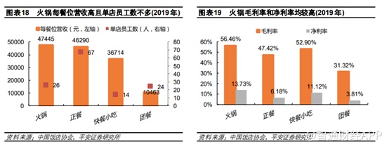 由于中餐因烹饪过程复杂,火候难以把控,菜品品质对厨师依赖度高,存在难以标准化的痛点;而火锅具有品类可控、底料和调料可统一配置、加工环节简单等特点,从而降低了对厨师的依赖并提高标准化程度,较其他中餐赛道具有连锁扩张优势。同时,火锅往往以半自助的形式食用,餐厅只需要提供标准化的食材和锅底,节省了后厨的占地面积及人数,经营效率更高,因此火锅是中式餐饮中的极佳赛道,更容易出现连锁化的龙头企业。根据中国饭店协会的数据,火锅的经营效率高于正餐、快餐等其他形式餐饮。