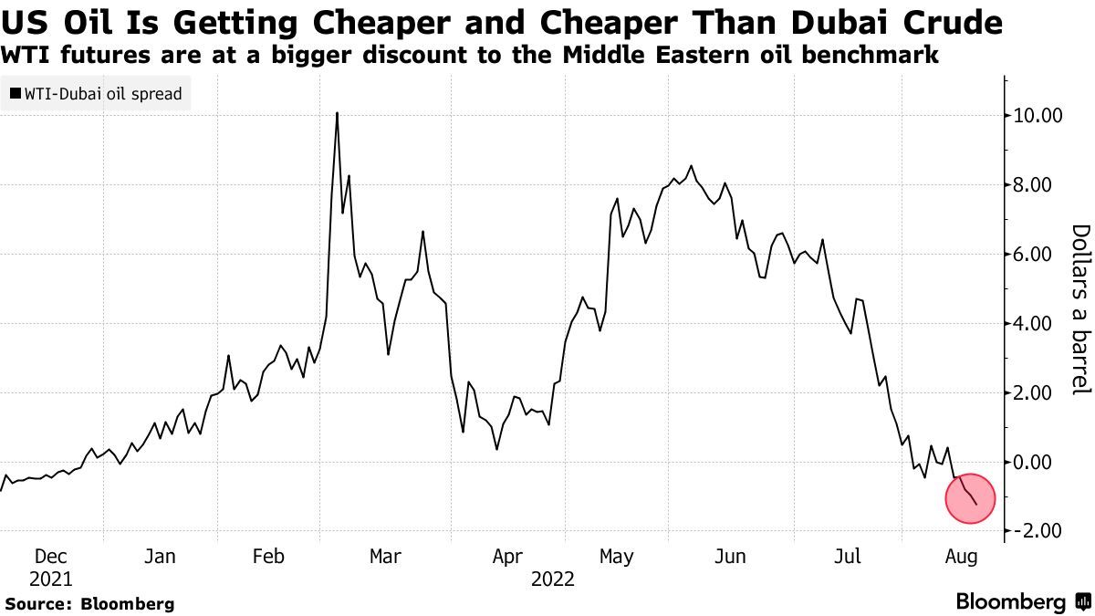 与中东石油基准相比,WTI期货折价幅度更大