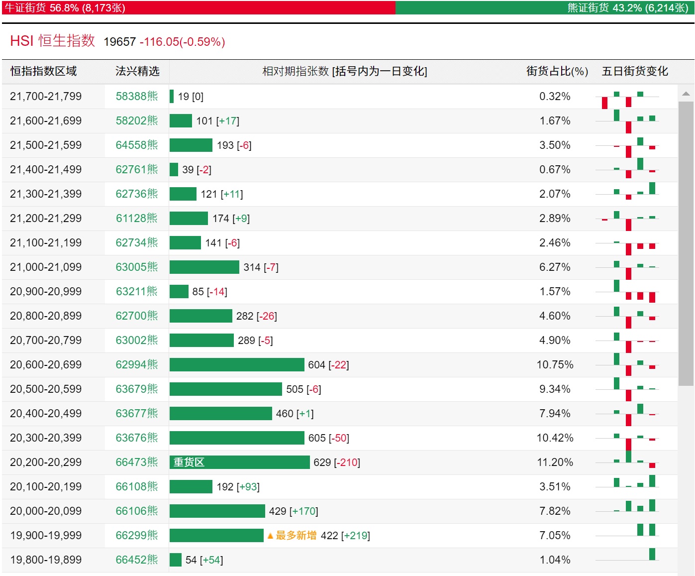 法兴恒指牛熊证街货分布图中的数据显示,熊证街货重货区在20200-20299区间,该区间最新熊证数量为629张,较上一交易日减少210张;最多新增在19900-19999区间,该区间最新熊证数量为422张,较上一交易日增加219张。