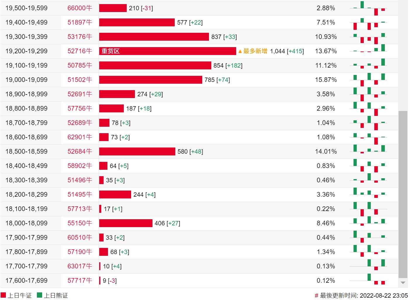 牛证街货重货区和最多新增都在19200-19299区间,该区间最新牛证数量为1044张,较上一交易日增加415张。