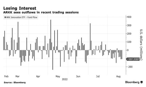 木头姐的ARKK已连续五个交易日出现资金流出,包括过去12个交易日中的11个交易日。今年迄今为止,除了6月份,这只ETF每个月都有资金流入,尽管自2022年开始以来,它的市值已经累计下跌近一半,该基金于本周一大跌2.4%。