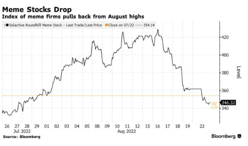3B家居(BBBY.US)股价下跌16%,此前有报道称,一些供应商在该公司拖欠货款后,开始限制或停止发货。这种悲观情绪也波及了其他meme股,其中GameStop(GME.US)于本周一下跌5.5%,AMC院线(AMC.US)下跌6.4%。