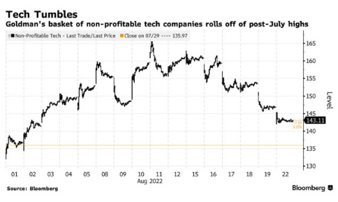 高盛一篮子非盈利科技公司股票于周一下跌2.6%,目前处于8月2日以来的最低水平。当投资者预计利率上升和通胀会侵蚀未来收益时,那些基于未来利润预期而估值极高的科技公司股价就会面临下跌风险。