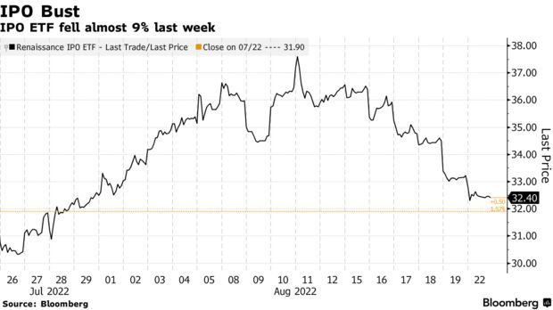 美联储激进的货币政策对新上市公司的打击尤为严重。Renaissance IPO ETF (IPO)上周下跌8.9%,创5月份以来最大单周跌幅。自今年年初以来,该基金已经累计下跌了约44%。