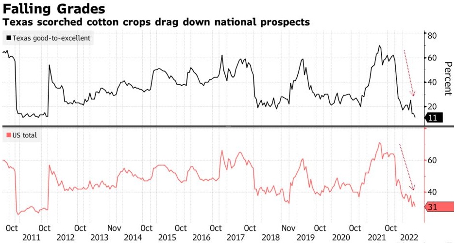 智通财经APP获悉,美国最大的棉花生产州德克萨斯州的棉花生产前景恶化,给全球棉花供应带来新的打击。美国农业部的数据显示,在截至8月21日的一周,得克萨斯州只有11%的作物被评为良好至极佳,低于一周前的14%,为2011年以来的最低水平。处于贫瘠到非常贫瘠环境中的植物比例从一周前的50%增加到59%。