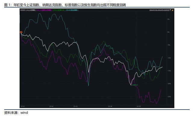 不仅仅是名义利率的提高,实际利率大幅走高也是影响今年上半年大类资产的核心逻辑。全球的风险资产和股票市场普跌。尤其是成长风格的股票,无论是美国的科技股,还是中国的赛道股大幅调整,甚至数字货币也都经历了一波断崖式下跌,相比高点的位置基本腰斩。抽取全球股市流动性导致标普、纳斯达克、上证、恒生等指数在今年均出现不同程度回调。