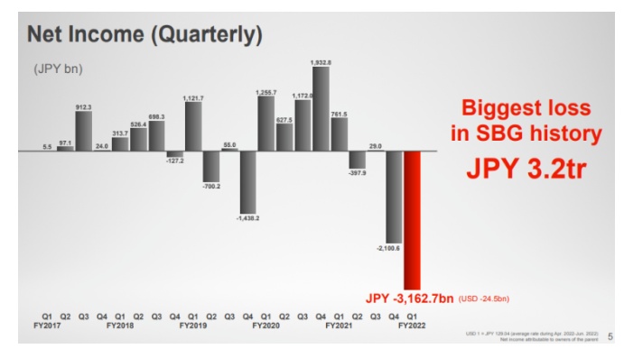 8月8日全球顶级风投公司软银集团亦公布了亏损的2022财年第一季度财报,实际时间指4月至6月份,这一季度,软银集团的净亏损达到了3.16万亿元,约合人民币1584亿元。重大亏损绝大多数都是来源于投资损失,其中更与旗下的软银愿景基金脱不开关系。软银愿景基金的投资损失为29338亿日元,其中愿景基金一期录得305亿日元的已实现亏损,未实现亏损为12153亿日元,愿景基金二期录得未实现估值损失总计13410亿日元。